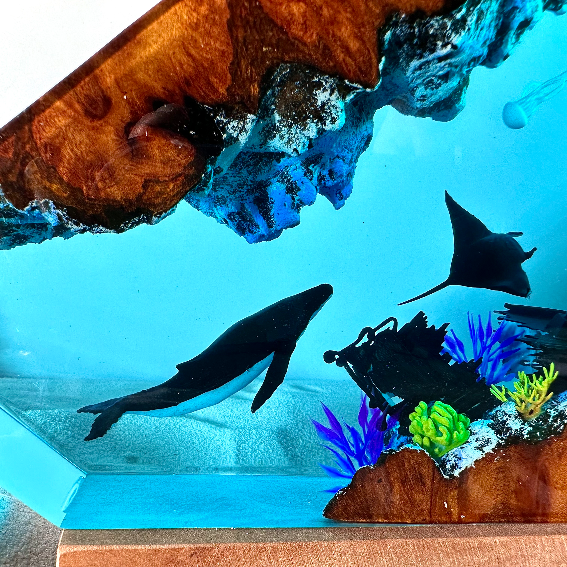 Humpback Whale and Ray resin night light – a product of our passion and dedication. What do you envision when you gaze upon it? For me, it's like peering into the depths of the ocean itself. I see a diver bravely navigating towards the majestic Humpback Whale, an encounter fraught with mystery and anticipation. Below them lies the haunting silhouette of a shipwreck, as if a fragment of the ocean's secrets is captured within this lamp. Its aura is one of mystery and strength.